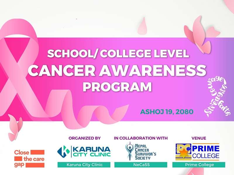 आश्विन १८, काठमाडौँ । अक्टोबर महिनालाई अन्तर्राष्ट्रिय स्तरमा नै स्तन क्यान्सर सम्बन्धी जनचेतनालाई प्राथमिकता दिँदै विभिन्न कार्यक्रमहरूका साथ सम्पन्न गर्ने गरिन्छ । सोही विषयमाथि लक्षित हुँदै असोज १९ गते, नेपाल क्यान्सर सरभाईबरस सोसाइटी तथा करुणा सिटी क्लिनिकद्वारा प्राइम कलेज, नयाँबजारमा क्यान्सर जनचेतनामूलक कार्यक्रम सञ्चालन गरिने निकासकी सचिव प्रमिला के.सी.ले बताइन् ।