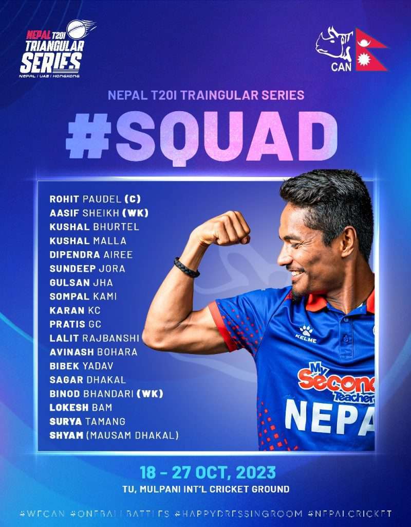 रोहित पौडेलको कप्तानीमा १८ सदस्यीय नेपाली टोली घोषणा गरिएको हो । टोलीमा सोमपाल कामी, करण केसी, गुल्सन झा, सन्दीप जोरा, कुशल भुर्तेल, कुशल मल्ल, विनोद भण्डारी, सागर ढकाल, लोकेश बम, सूर्य तामाङ, श्याम ढकाल, प्रतीश जिसी, दीपेन्द्रसिंह ऐरी, आसिफ शेख, विवेक यादव, ललितनारायण राजवंशी र अविनाश बोहरा छन् ।