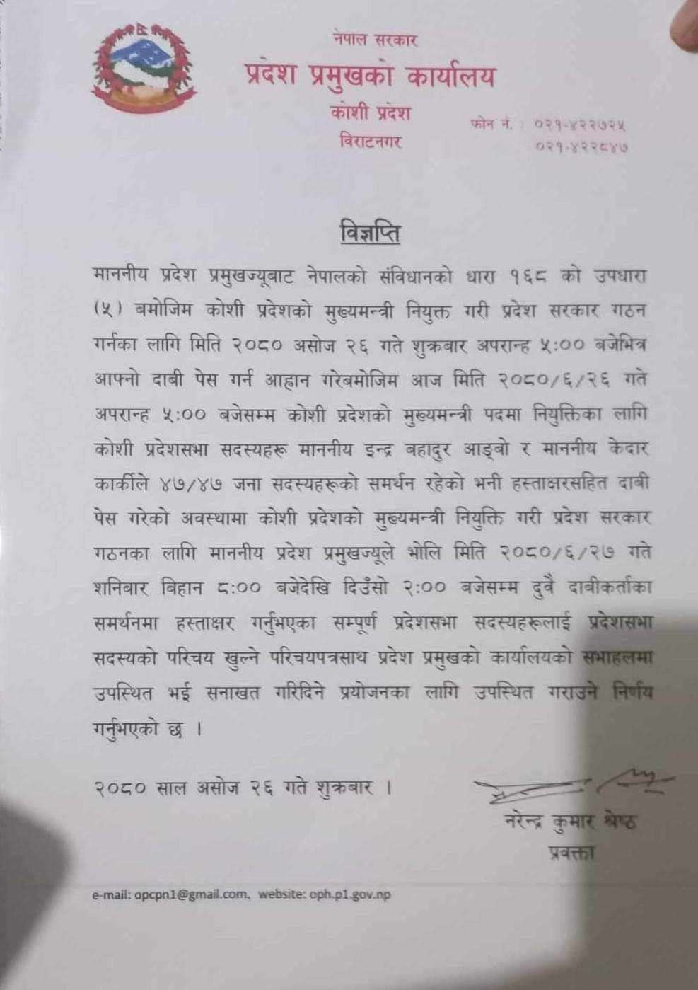 हिजो साँझ ५ बजेसम्म दुई जनाको दावे दारी प्रस्तुत भए पछि प्रदेश प्रमुख परशुराम खापुङले आज दुवै पक्षका सांसदहरूको सनाखत गराउन लागेका छन् । बिहान ८ बजे देखी दिउँसो २ बजे भित्र सनाखत गराई सके पछि आज मुख्यमन्त्री नियुक्ति गर्ने उनको सचिवालयले जनाएको छ ।