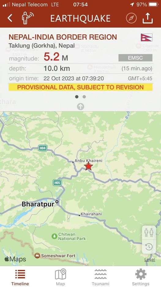 काठमाडौँ, कार्तिक ५ । गोरखाको आबुखैरेनी केन्द्रबिन्दु भएर दोस्रो भूकम्प आएको छ । भूकम्पको गहिराई ५.२ मेग्नीच्युडको थियो । काठमाडौँ उपत्यकामा पनि भूकम्पको धक्का महसुस भएको छ । धक्काले दसैँको रमझममा रहेकाहरूलाई झस्काएको छ ।