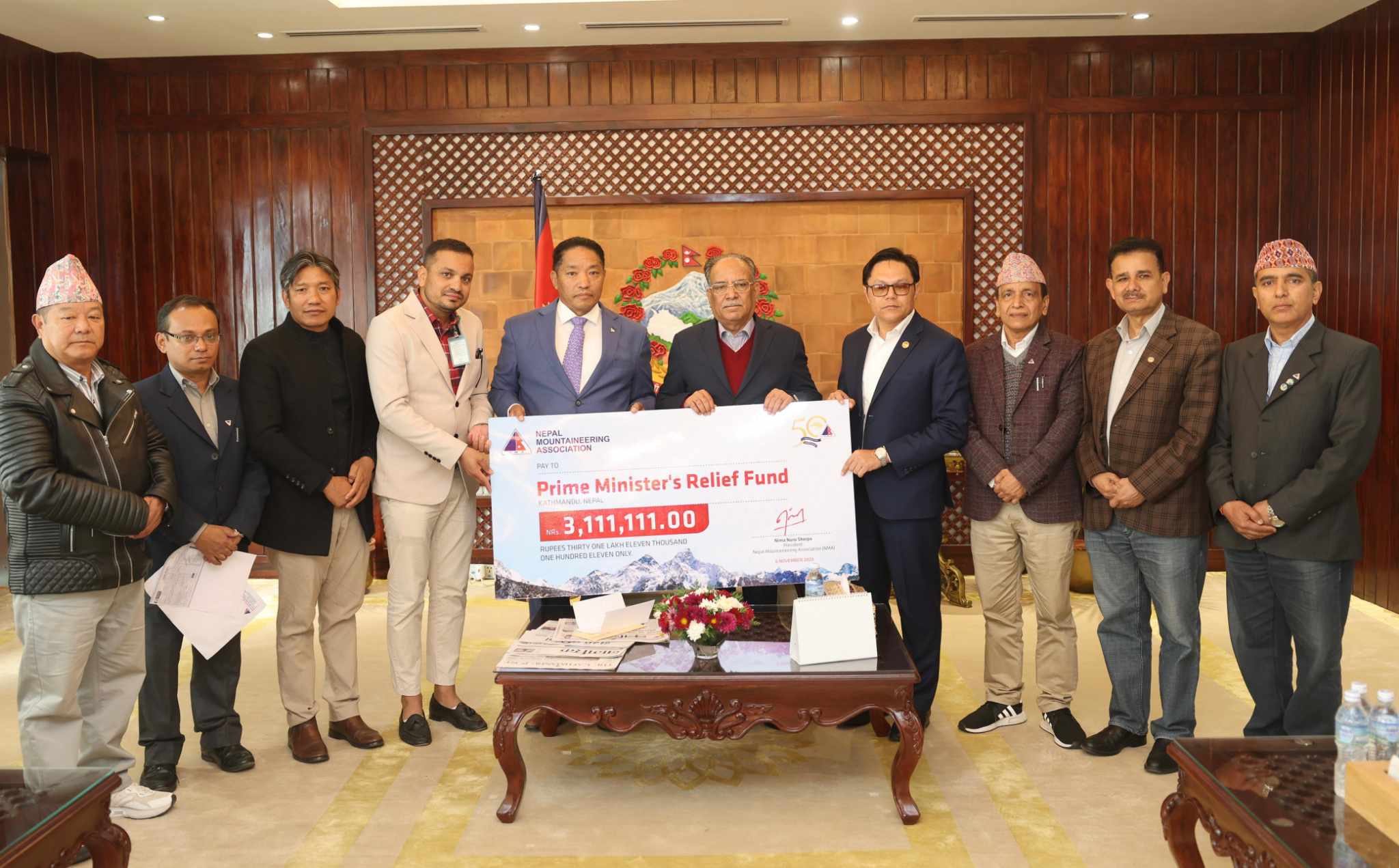 बुधबार बिहान बालुवाटारमा पर्यटन मन्त्री सुदन किरातीको नेतृत्वमा आएको प्रतिनिधिमण्डलले प्रधानमन्त्री पुष्पकमल दाहाल ‘प्रचण्ड’ लाई भेटेर सहयोग रकम हस्तान्तरण गरेको प्रधानमन्त्रीको सचिवालयले जनाएको छ ।