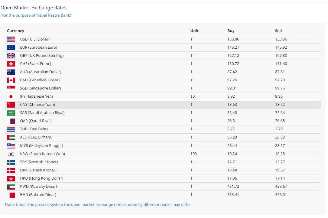 जापानी येन १० को खरिददर ८ रूपैयाँ ९२ पैसा तथा बिक्री दर ८ रूपैयाँ ९६ पैसा बराबर भाउ पाउँदा चाइनिज युआन १ को खरिद दर १८ रूपैयाँ ६३ पैसा तथा बिक्री दर १८ रूपैयाँ ७२ पैसा कायम गरिएको छ ।