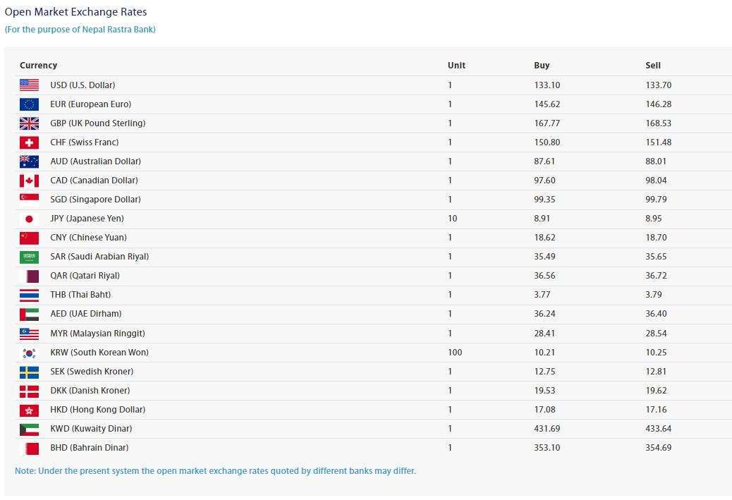 राष्ट्र बैंकले आजका लागि अमेरिकी डलरको १ को खरिद दर १३३ रुपैयाँ १० पैसा र बिक्री दर १३३ रुपैयाँ ७० पैसा कायम गरेको छ भने युरोपियन युरो एकको खरिद दर १४५ रुपैयाँ १० पैसा र बिक्री दर १४६ रुपैयाँ २८ पैसामा कारोबारको अनुमति दिएको छ ।