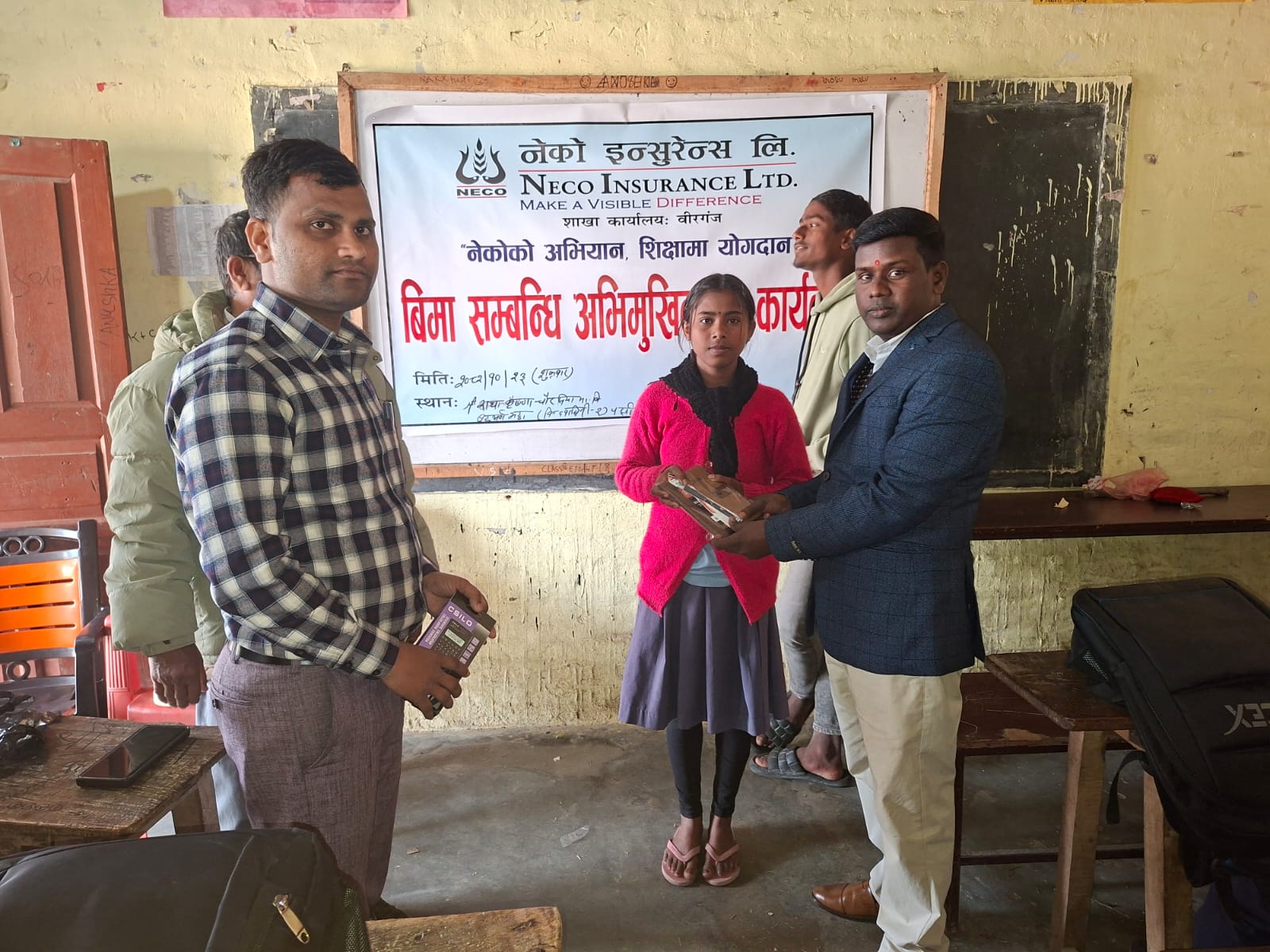 नेको इन्सुरेन्स लि. लिंक रोड वीरगंज शाखाका इन्चार्ज ओम प्रकाश पटेल र वीरगंज शाखा कर्मचारी प्रनिश सापकोटाले सो स्कूलमा अध्यनरत्त कक्षा ९ र १० का विद्यार्थीहरुलाई बिमा के हो ? बिमा कसरी हुन्छ, यसबाट हुने फाईदाहरु लगायतका विषयमा जानकारी गराएका थिए ।